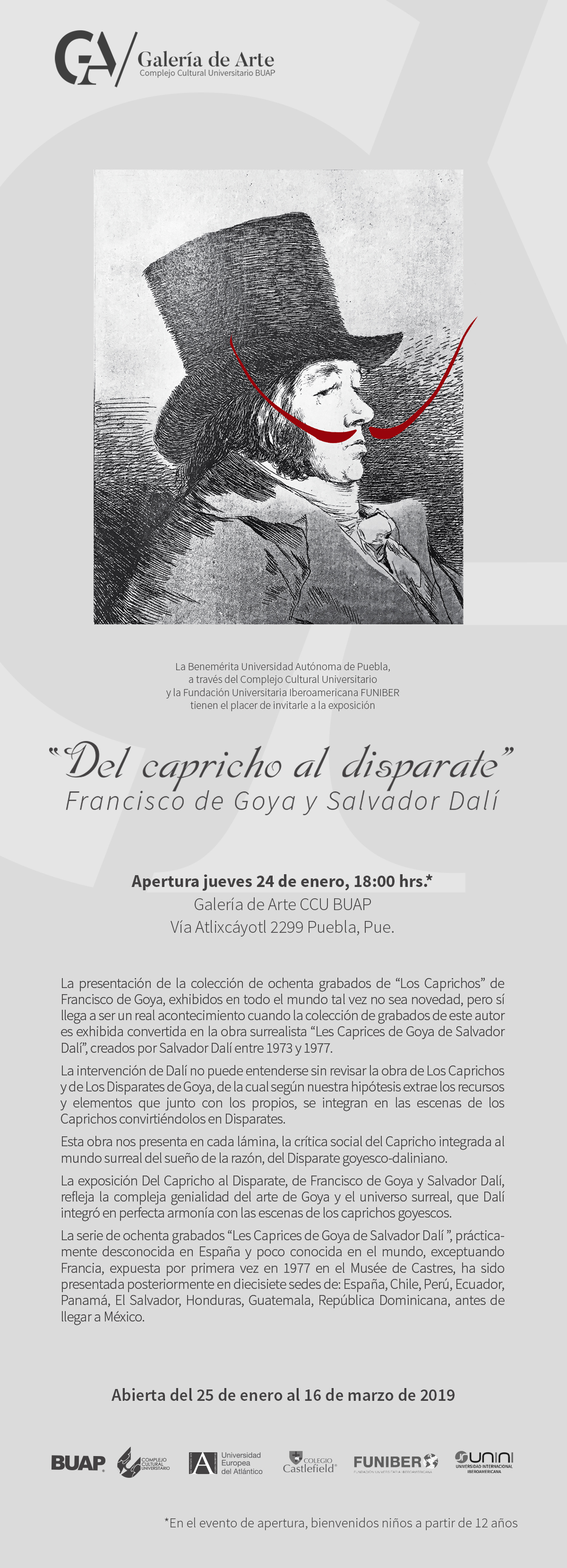 Del 24 de enero al 17 de marzo se podrá visitar en la Benemérita Universidad Autónoma de Puebla (México) una exposición con 80 grabados de los pintores españoles Francisco de Goya y Salvador Dalí. La muestra, titulada “Del capricho al disparate”, contiene obras pertenecientes a la Obra Cultura de FUNIBER y ha sido patrocinada por FUNIBER y UNINI México.