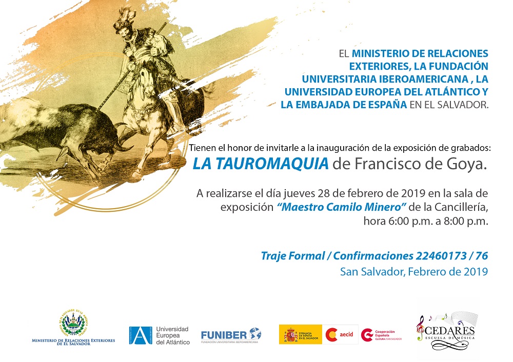 Del 28 de febrero al 29 de marzo se podrá visitar por primera vez en El Salvador la colección “La Tauromaquia” de Francisco de Goya. La muestra, perteneciente a la Obra Cultural FUNIBER, está compuesta por 40 grabados en los que aparecen representados diferentes momentos icónicos de la tradición española de las corridas de toros.